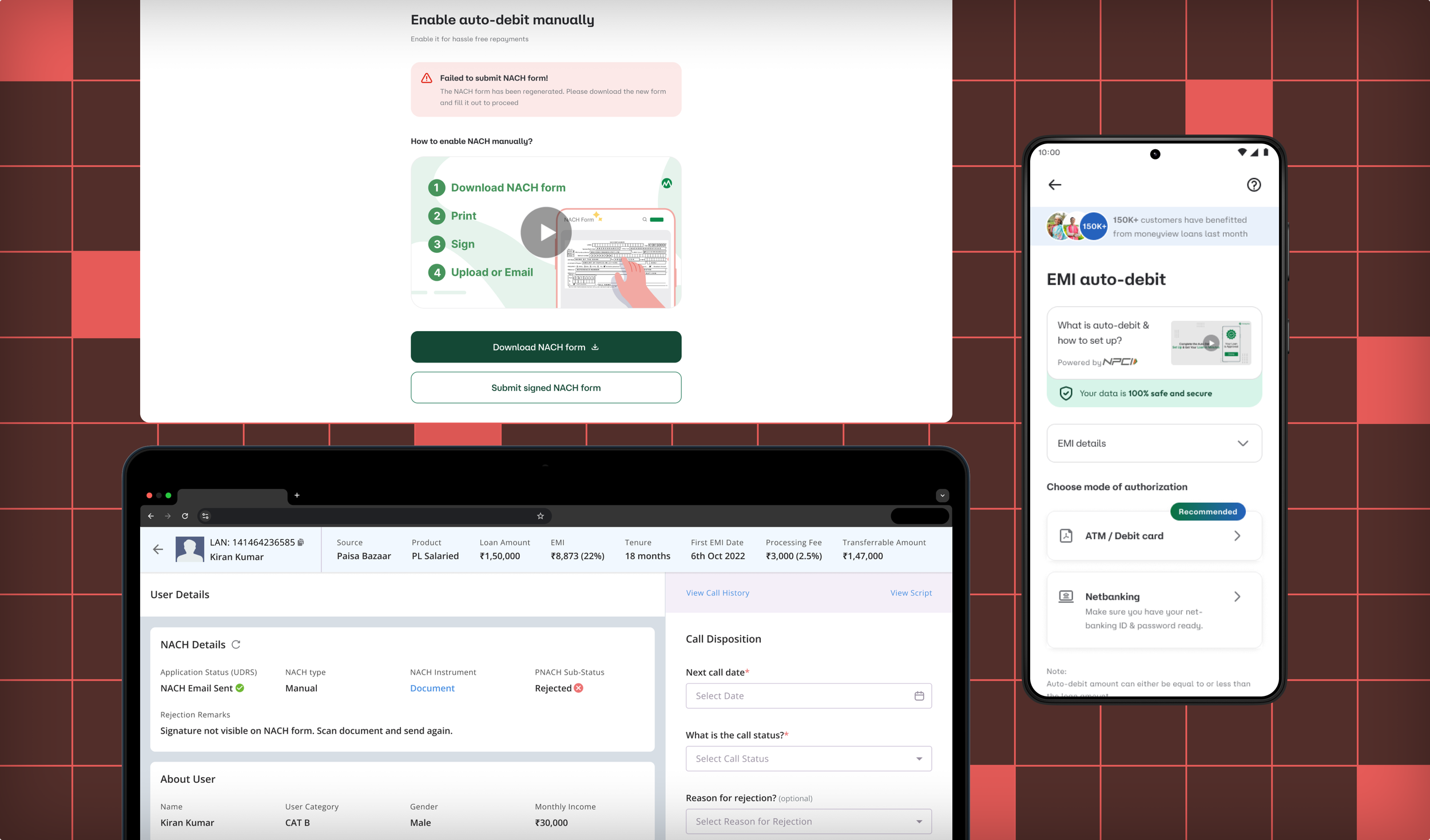 Moneyview wanted to improve conversion at high-intent steps, and customers signing the auto-debit stage was one of them. Both the internal CRM used by support agents and the customer-facing setup flow—to reduce friction in auto-debit activation.